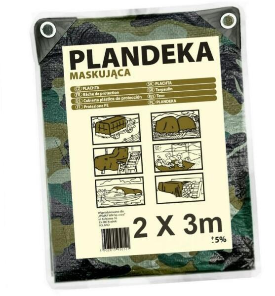Takaróponyva 2×3 m – Plandeka, 80 g/m2 zöld terepmintás vízálló ponyva A takaróponyva nélkülözhetetlen eszköz, ha tárgyakat, anyagokat vagy felületeket kell megvédeni a csapadéktól, portól vagy egyéb külső hatásoktól. A Plandeka gyártmányú, 80 g/m2 sűrűségű, zöld terepmintás ponyva erős és tartós polietilénből készült, így hosszú távon biztosítja a kívánt védelmet. A mintázatnak köszönhetően diszkréten beleolvad a környezetbe, ezért különösen kedvelt erdei, kerti és kültéri használatra. Takaróponyva termékadatok