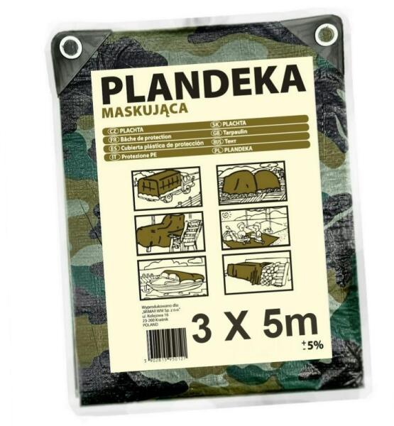 Takaróponyva3×5 m – Plandeka, 80 g/m2 zöld terepmintás vízálló ponyva A takaróponyva nélkülözhetetlen eszköz, ha tárgyakat, anyagokat vagy felületeket kell megvédeni a csapadéktól, portól vagy egyéb külső hatásoktól. A Plandeka gyártmányú, 80 g/m2 sűrűségű, zöld terepmintás ponyva erős és tartós polietilénből készült, így hosszú távon biztosítja a kívánt védelmet. A mintázatnak köszönhetően diszkréten beleolvad a környezetbe, ezért különösen kedvelt erdei, kerti és kültéri használatra. Takaróponyva termékadatok
