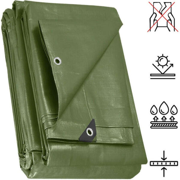 Vízálló Polietilén Takaróponyva - 6x9m, UV Védelemmel ☀️ Ez a 6x9 méteres zöld polietilén takaróponyva kiváló védelmet nyújt tárgyaidnak az időjárás viszontagságai ellen. Vízálló, UV-álló és rendkívül strapabíró, így ideális választás autók, motorok, mezőgazdasági gépek, tűzifa, széna és építőanyagok védelmére is. Kiemelt jellemzők:Erősített szélek és sarkok: Megakadályozza a könnyű elszakadást. ? 100 cm-enként alumínium fűzőlyukak: Könnyű rögzítés bármilyen felületen. ? 120g/m2 vastagság: Megfelelő rugalmasság és tartósság. ?️ UV védelem: Megakadályozza az anyag öregedését és morzsolódását. ☀️ Vízálló és fagyálló: Minden évszakban védelmet nyújt. ?❄️ Könnyű súly: Könnyű kezelhetőség. ? Alkalmazási területek: Járművek védelme (autók, motorok) Mezőgazdasági és kertészeti gépek védelme Építőanyagok, tűzifa, széna védelme Fészerek, tetőburkolatok, kerti medencék letakarása Felújítási területek védelme Műszaki adatok:Tulajdonság ÉrtékMéret 6x9 mVastagság 120 g/m2Anyag PolietilénSzín ZöldVízállóság IgenFagyállóság IgenFűzőlyukak 100 cm-enként, 11 mm-es alumíniumMegjegyzés: A ponyva méretei enyhe eltéréseket mutathatnak (max. 5%).